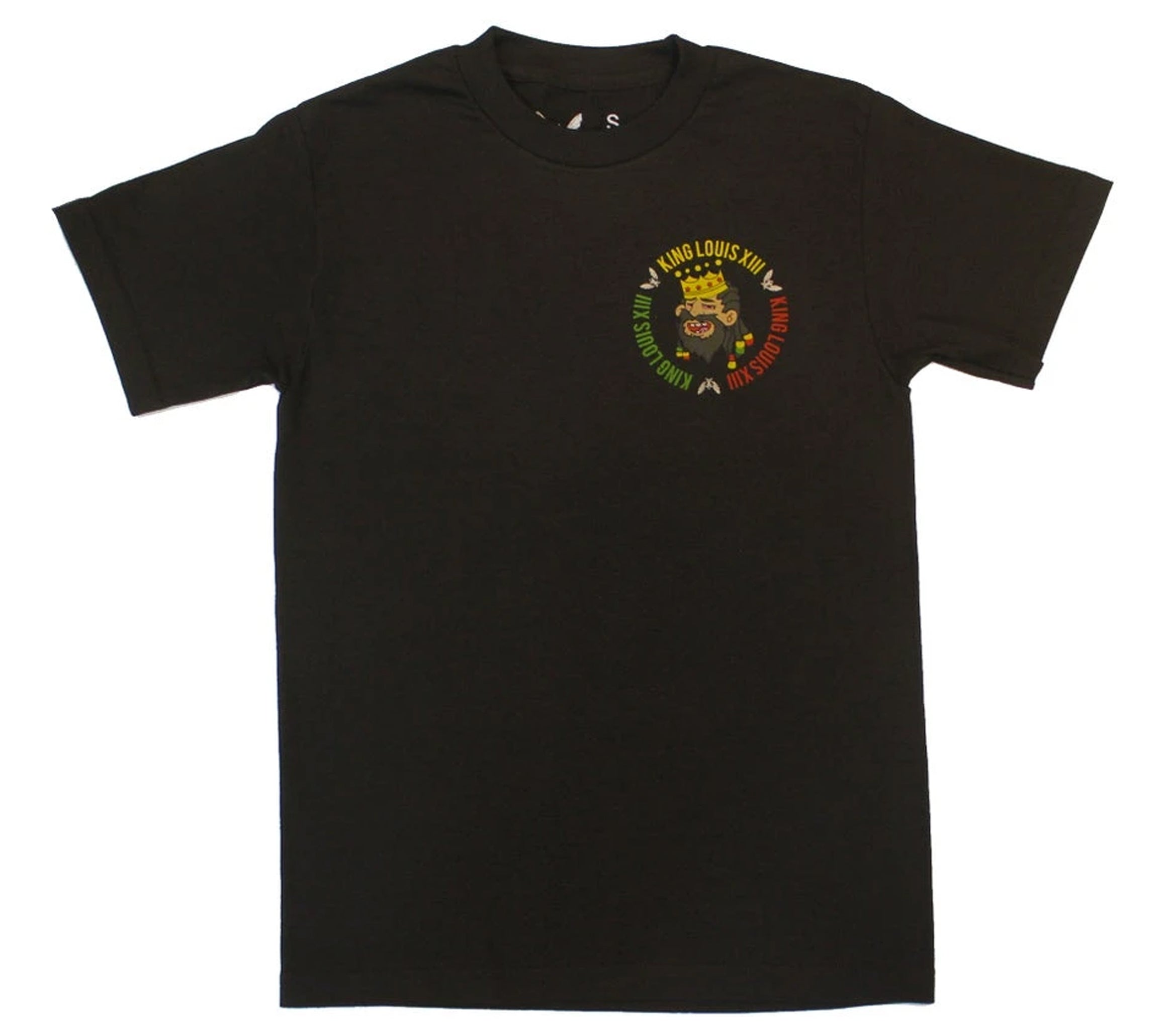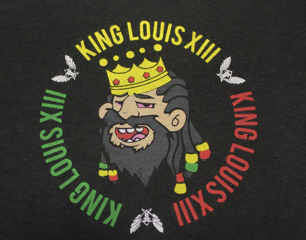Throw on this tee to rock one of your favorite strains King Louis XIII. It displays a cartoon graphic rastafarian man with long dread locks with pasta beads. Black shirt with a rasta...