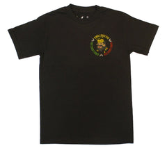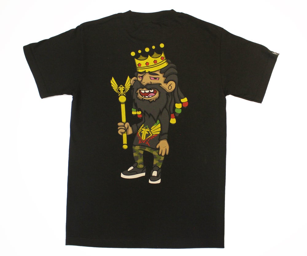 Throw on this tee to rock one of your favorite strains King Louis XIII. It displays a cartoon graphic rastafarian man with long dread locks with pasta beads. Black shirt with a rasta colored Fortune Fly Logo, camo pants, wearing a golden crown and holding a golden Fortune Fly scepter. This image is outline by small Fortune Fly Logos and also reads "Fortune Fly" three times. Each colored in red, green, and yellow forming a circle around the King Louis character.
